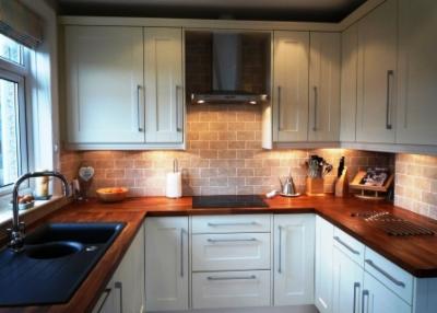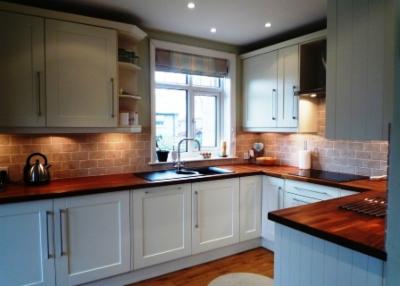 Ivory vinyl shaker units teamed with solid wood Iroko worktops create a warm, timeless feel yet remains highly practical, which was a 'must' in this busy family kitchen. | ![]() |