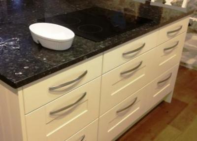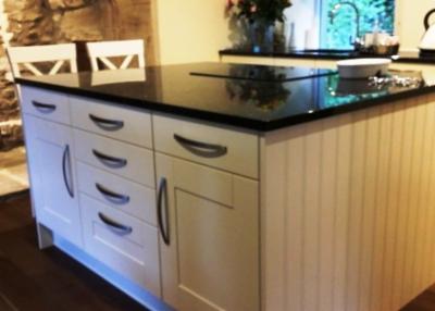 Island Unit incorporating ample storage as well as providing informal dining. | The island unit also houses the induction hob, the surrounding granite worksurface offering plenty of prepping and cooking space. |