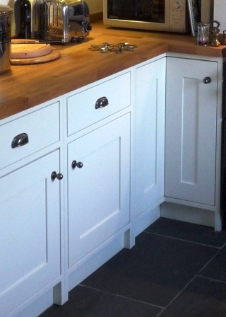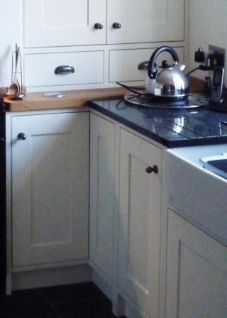 ![]() | ![]() This In-Frame Kitchen was bespoke built to fit this old traditional cottage. Made to measure units fit perfectly in the original alchoves either side of the chimney breast. A combination of granite and solid oak worktops complement the cottage style whilst providing a practical surface around the traditional inset Belfast sink. Drainer grooves were manufactured in the granite worktop. |