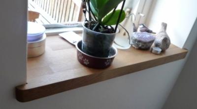 ![]() | ![]() Custom-built solid oak window sill to complement the radiator seat and kitchen. |