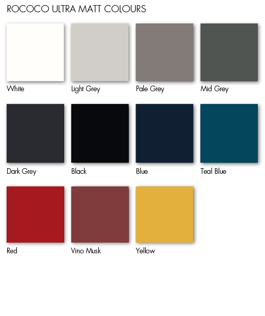![]() | Rococo ultra matt A contemporary non-reflective finish, soft to touch, fingerprint resistant and durable. The versatile palette offers a choice of vibrant primary colours for the ultimate colour injection and subtle ‘on trend’ tones. Available handle-less or with a choice of handles. Rococo may be paired with any of the colours in the Colour Fusions collection, see colours below. |