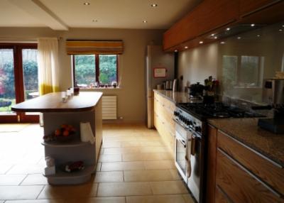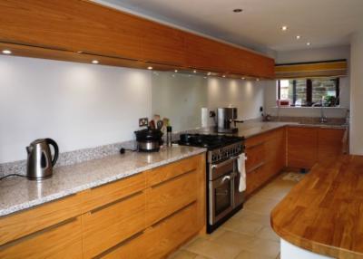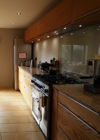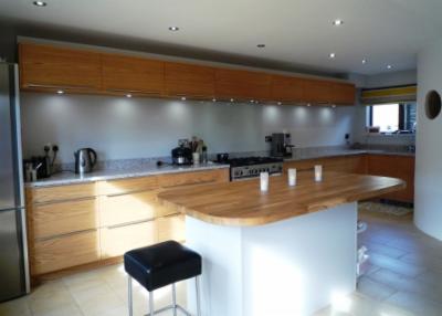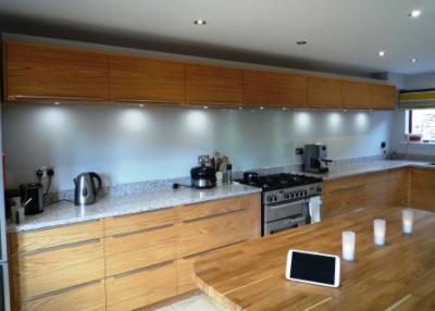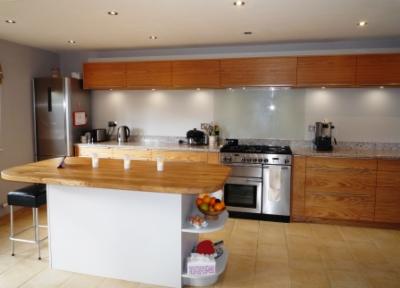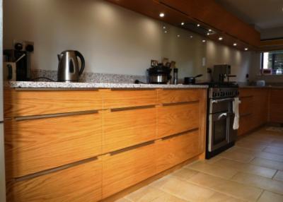 ![]() | This bespoke hand built kitchen was commissioned out of veneered oak. The design brief was to create a modern, practical kitchen using natural materials as much as possible. The quartz worktop is manufactured from eco friendly recycled materials, with a solid oak top for the central hand painted island unit. |