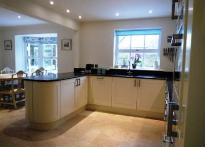 The brief was to create an open plan kitchen / diner with a return run which could double up as a breakfast bar area. The Skipton Kitchen Company removed the wall between the original, much smaller kitchen and seperate dining room and installed underfloor heating throughout the tumble marble tiled new kitchen / diner. | ![]() |